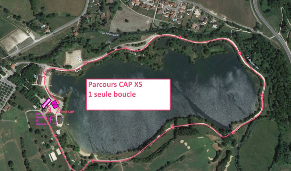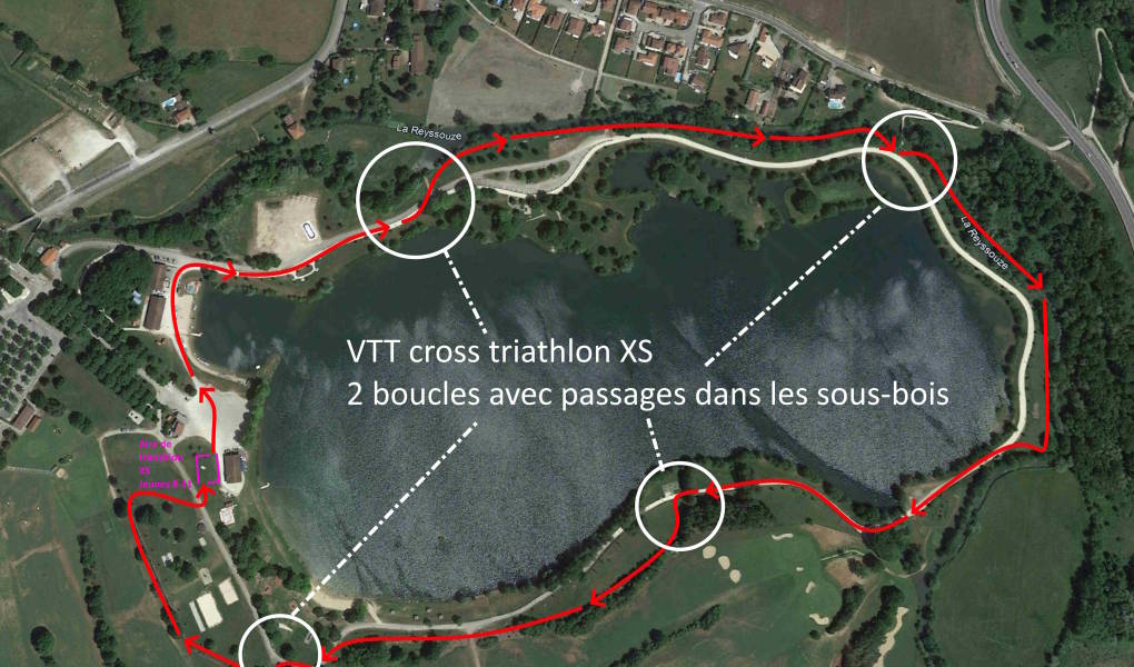 Le parcours vélo est composé de 2 boucles identiques de 2,5km autour du plan d'eau, partiellement sur le chemin blanc gravillonné, partiellement dans l'herbe (coupée) dans les sous-bois en bord de rivière.