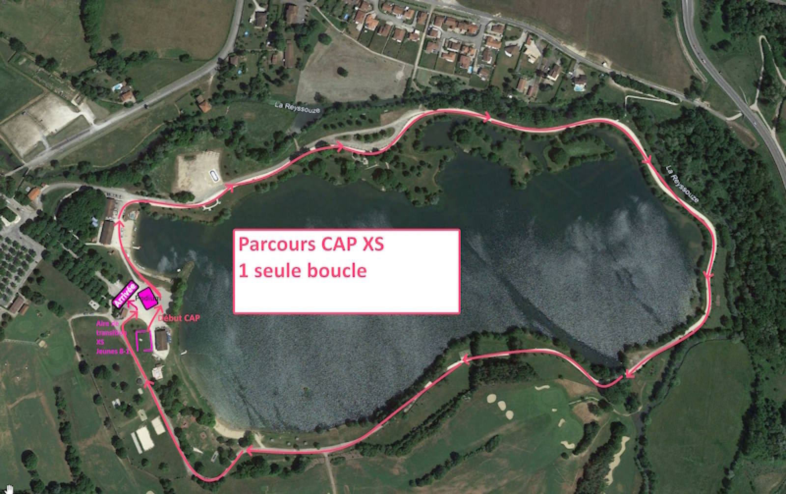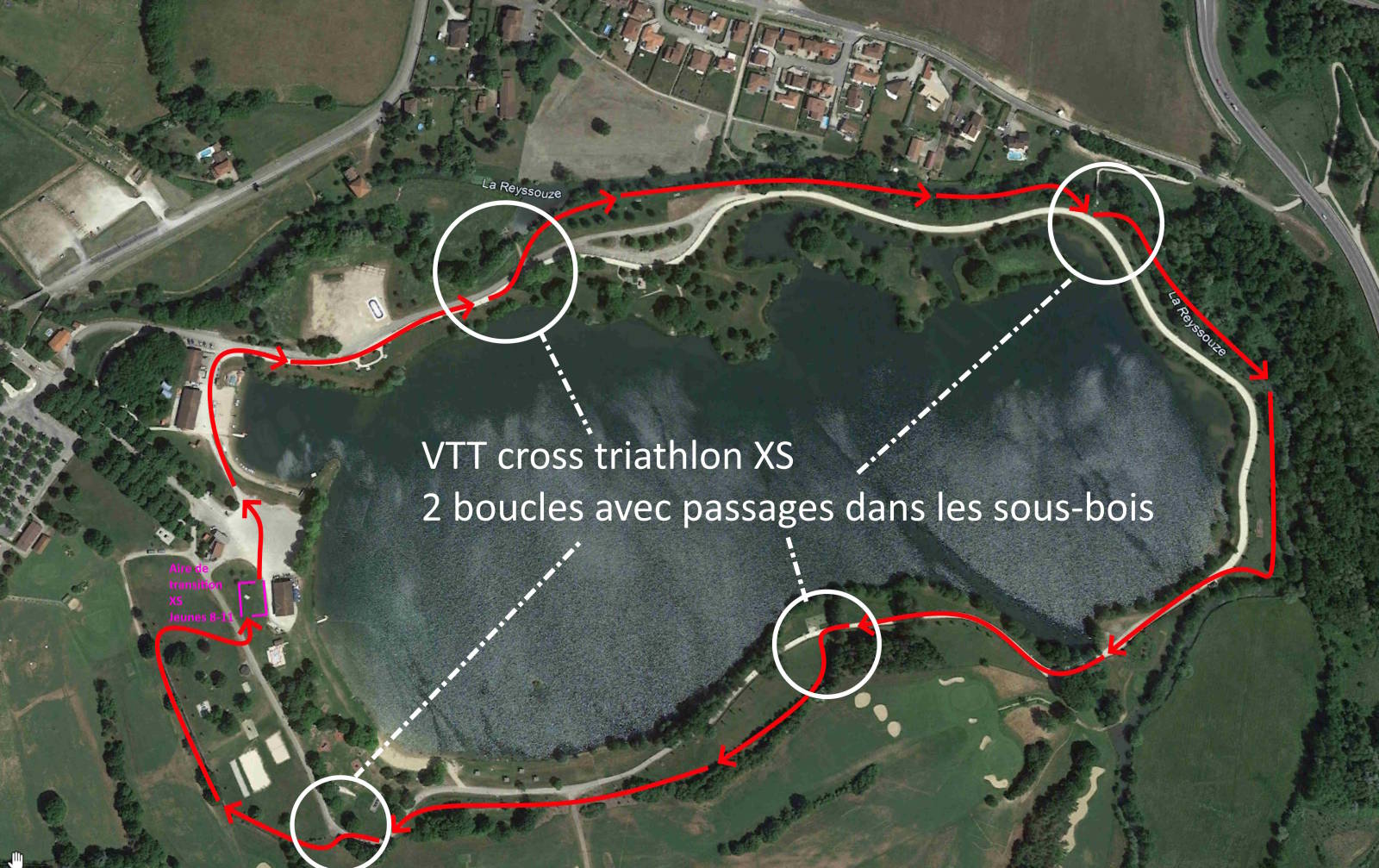 Le parcours vélo est composé de 2 boucles identiques de 2,5km autour du plan d'eau, partiellement sur le chemin blanc gravillonné, partiellement dans l'herbe (coupée) dans les sous-bois en bord de rivière.